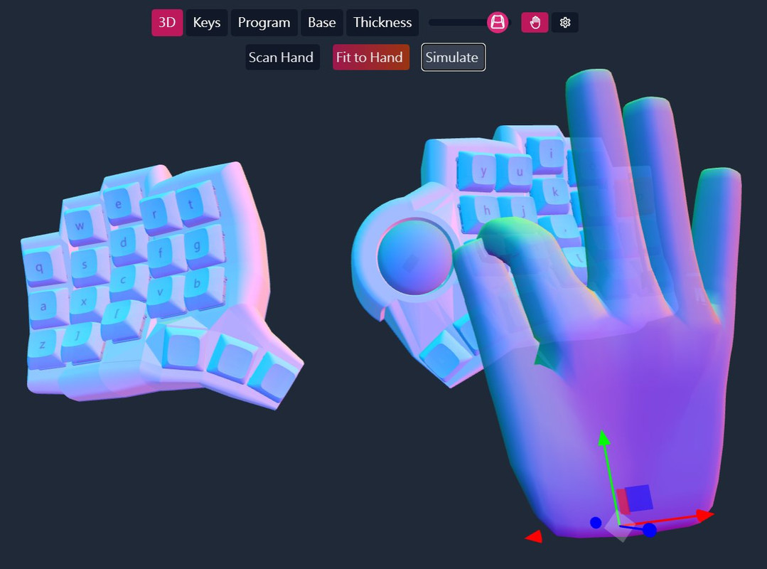 這次使用了大神rianadon的Cosmos Keyboard Configurator(要付費$5,便宜),透過連線手機鏡頭3D掃描自己的手部活動、模擬出手部模型後生成鍵盤角度,即使是如此省事也是印了超多調整版本。