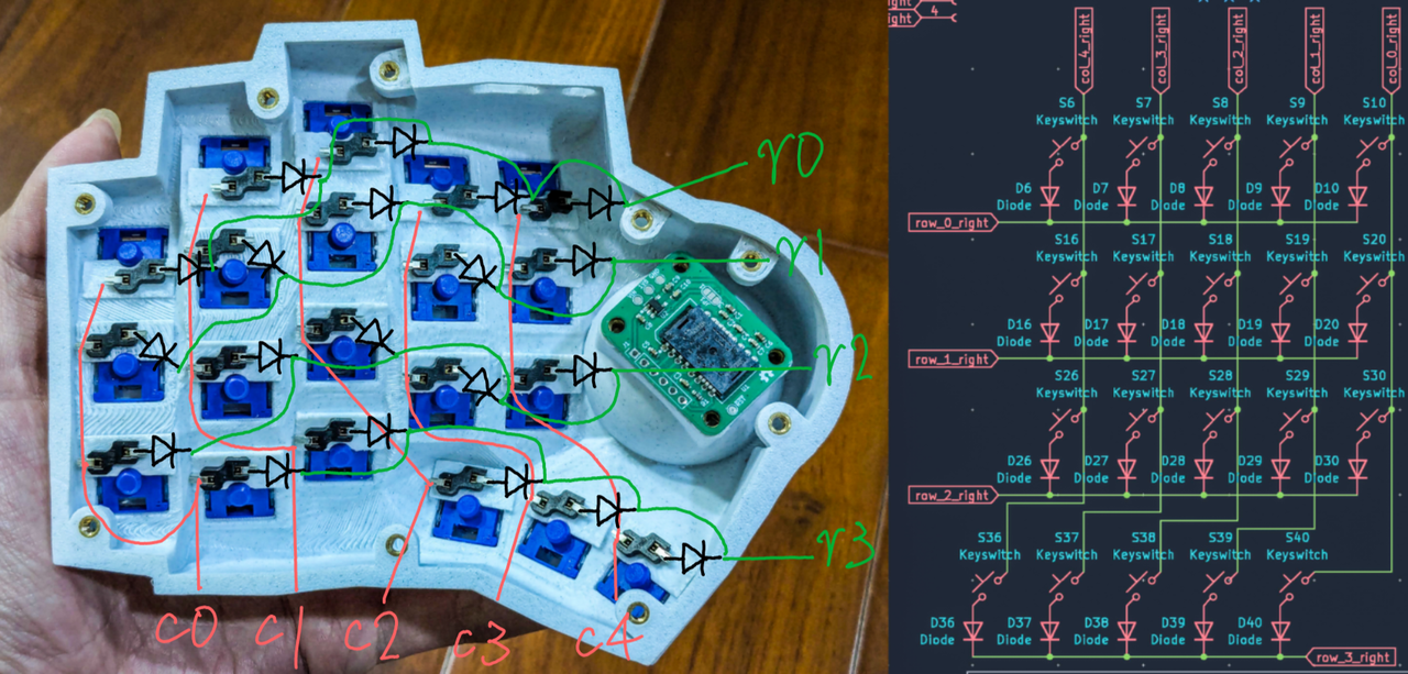 這是自己第一次不靠平面PCB、全靠手焊接線完成的作品,其實比想像中簡單許多,但中間失敗了一次(剛好想改角度,所以直接報廢,加上col/row想改位置),第二次上得心應手許多,但還是花了至少6小時、腰酸背痛...