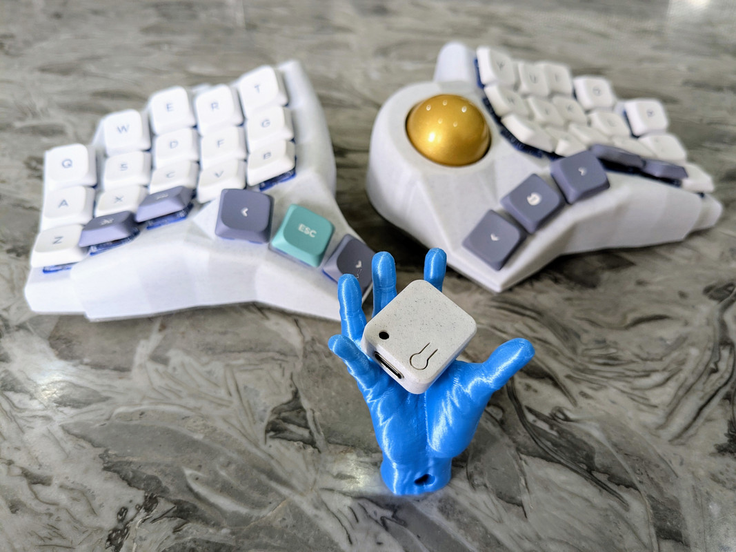 這是自己設計的第三個無線鍵盤,也是第一個根據手部掃描生成的3D鍵盤、第一個滑鼠,至7月中時完成手焊與初步韌體編程;8月中完成插即用的2.4Ghz Dongle、ZMK Studio整合、Scroll層、最佳化傳輸頻率、內建鼠標加速(cursor acceleration)等,所有想上的功能都完整化了。