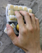 軌跡球位置有些高,拇指在操縱軌跡球時,手指實在不知道該用哪些鍵作為左右滑鼠鍵,手腕自然的角度下根本按不到幾顆。